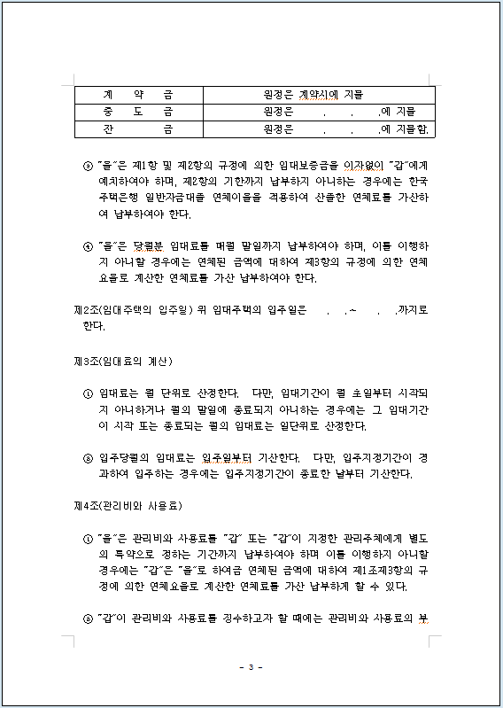 • 차임 액수는 정확히 기재하고 지급방법, 지급시기 등을 명확하게 규정해야 합니다.