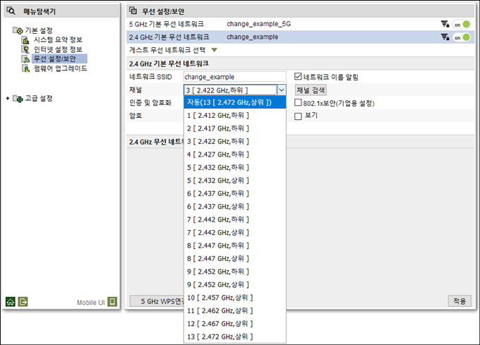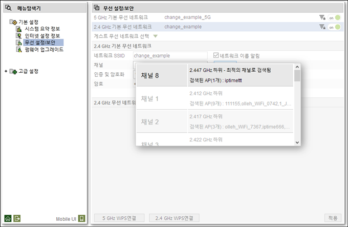 이럴 때는 수동으로 채널을 변경해 보면서 문제가 없는 채널을 찾아서 사용해 보시기 바랍니다.